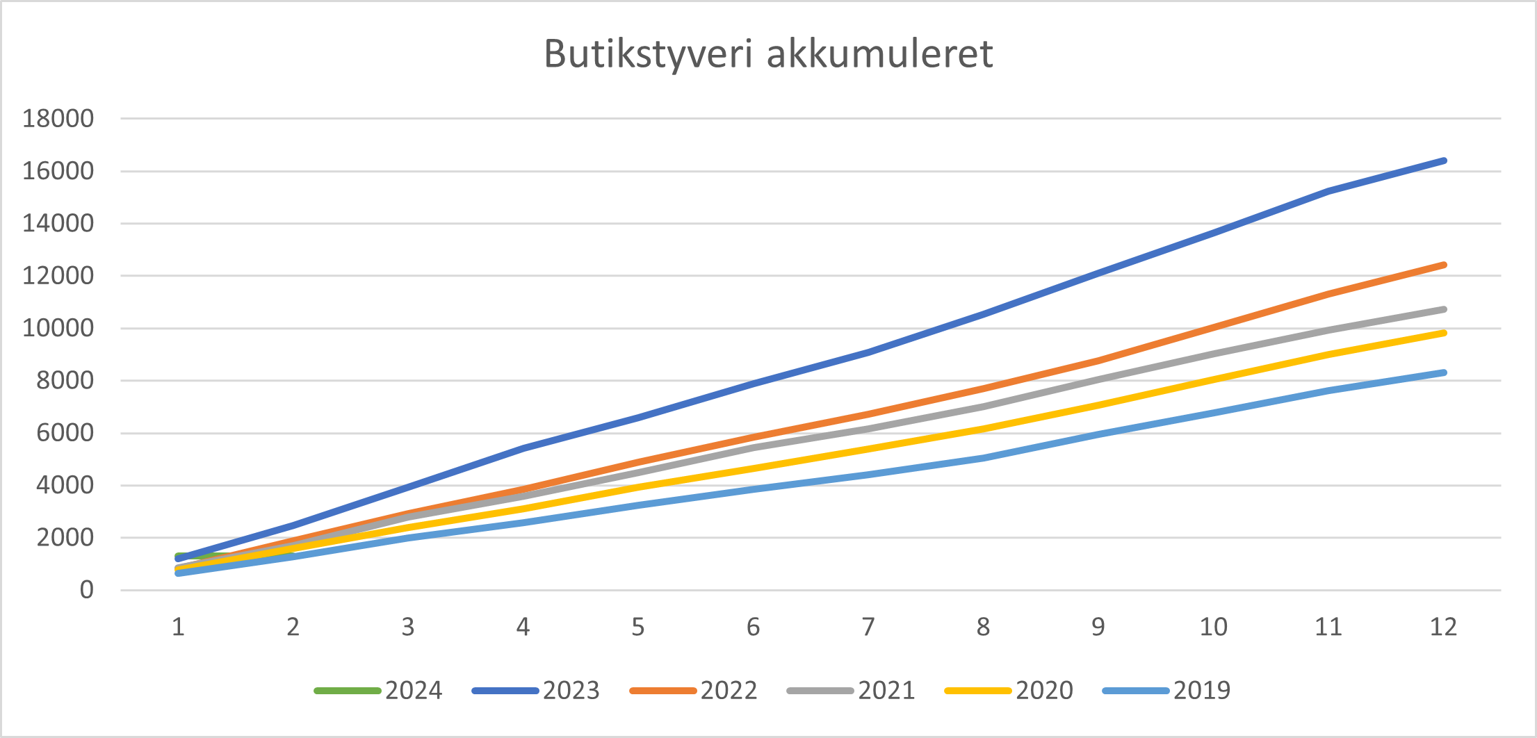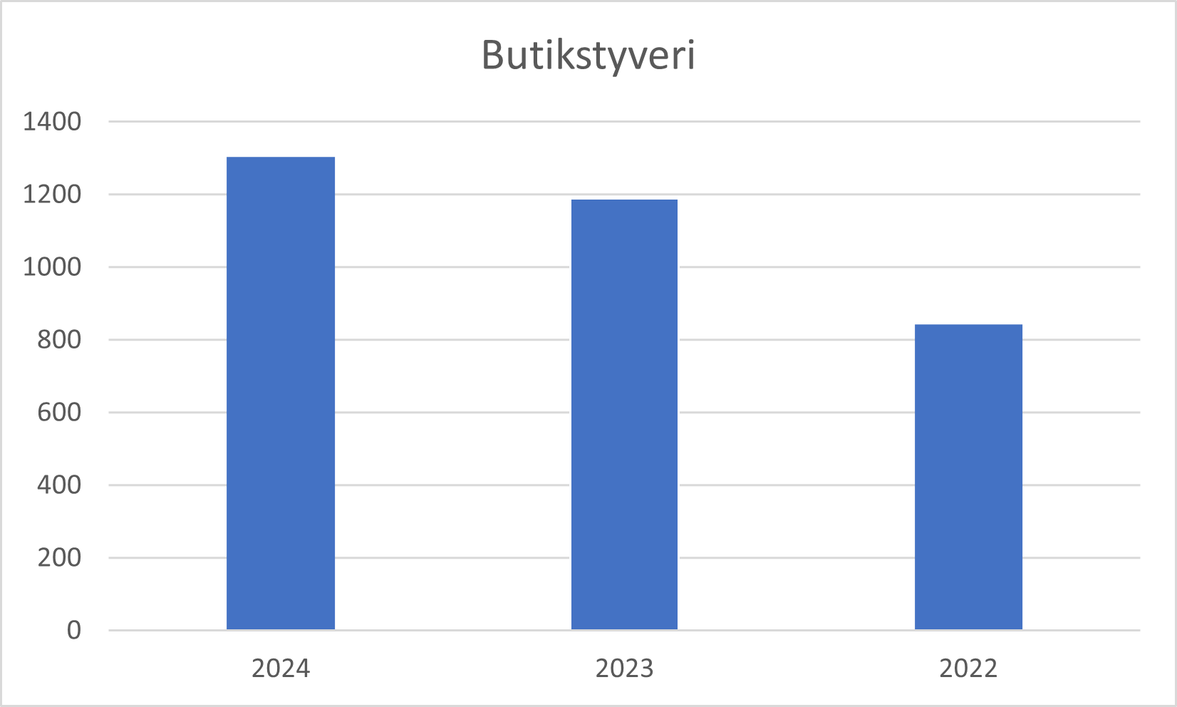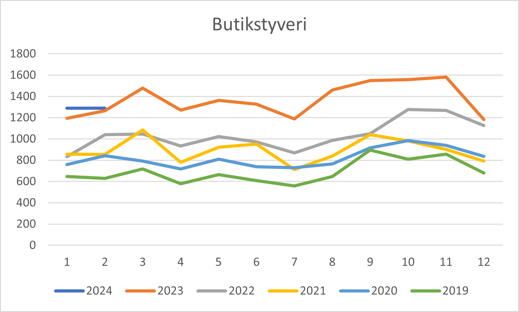 I første måned af 2024 blev der registreret 1.303 butikstyverier, hvilket er 114 flere end i januar 2023 svarende til en procentvis stigning på knapt 10 procent. Siden 2022 er dette en stor stigning på knapt 55 procent. Bedre nyheder er, at både indbrud og røverier er på det laveste niveau for januar måned sammenholdt med 2022 og 2023. Siden 2023 er både røverier og indbrud faldet med 50 procent.