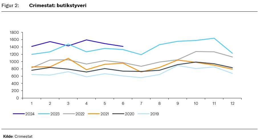 Hvis der ikke bliver lagt flere ressourcer i forebyggelse af kriminaliteten, så vil denne stigning fortsætte. Efter første halvår af 2024 ligger antallet af registrerede butikstyverier mere end 15 procent over, hvor det var samme tidspunkt sidste år, så hvis ikke udviklingen vender, så forventes det at vi ender på en samlet forøgelse af registrerede butikstyverier på mindst seks til ti procent.