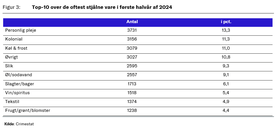 Når folk listigt sniger sig forbi kassen med lommerne fulde, eller kun scanner halvdelen af varerne i kurven, hvad er det så præcist der forsvinder? Ud fra det første halve år af 2024, kan det konkluderes at den oftest stjålne vare er kategorien ”Personlig pleje”. Det var samme tendens i 2023. Derefter er det særligt madvarer som butikstyvene stjæler. Herunder er det ”Kolonial” der er blevet stjålet 11,3 pct. af gangene og ”Køl & frost” følger stærkt trop på 11 pct. Overordnet udgør top-10 over de oftest stjålne vare i første halvår af 2024 ca. 85 pct. af alle de stjålne varer i første halvår af 2024.