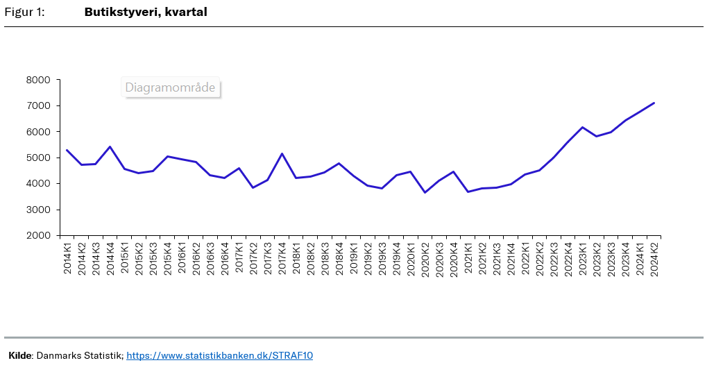I andet kvartal af 2024 blev der på platformen Crimestat registreret 4.504 butikstyverier, og der var samlet registreret 8.890 butikstyverier samt 27.984 stjålne vare, gennem Crimestat det første halve år af 2024. I det første halve år af 2023 blev der registreret 7.906 butikstyverier, og der er dermed sket en stigning på ca. 12 pct. sammenholdt med det første halvår af 2024. Hvis man ser længere tilbage i tiden, så var der registreret 3.850 butikstyverier i første halve år af 2019, svarede til en procentvis stigning på ca. 131 pct. sammenholdt med det første halvår af 2024. Det er dermed en yderst tydelig og skræmmende stigning, der særligt har taget fart de sidste to år.