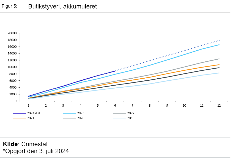 Det første halve år af 2024 har nu passeret, og den negative udvikling i butikstyverier fortsætter som tidligere forudset. April måned slog rekord med det højeste antal registrerede butikstyverier i 2024, og juni måned kommer som et lille lyspunkt.