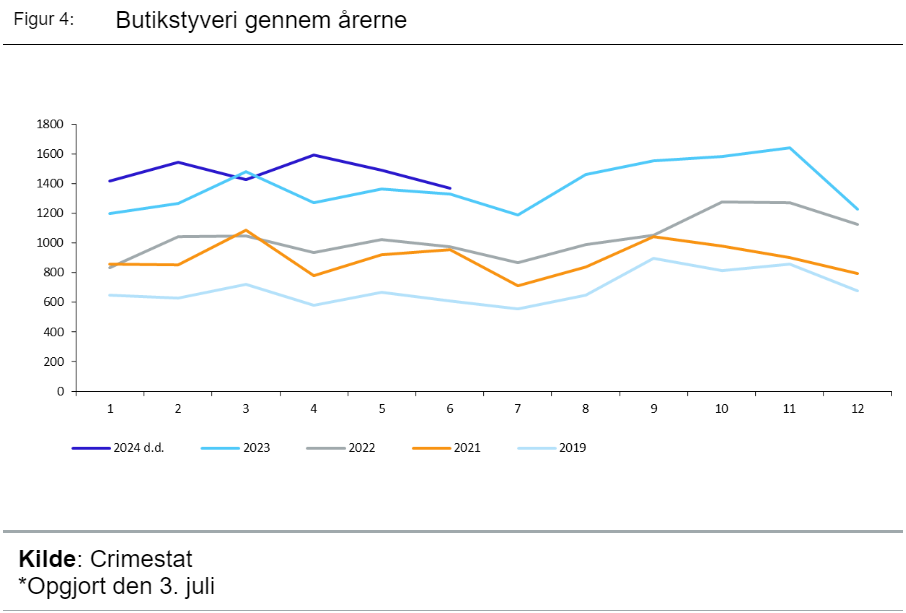 I maj 2024, blev der imidlertid registreret 1.491 butikstyverier. Dermed er der registreret knapt 9 pct færre butikstyverier i juni 2024, end i maj 2024.