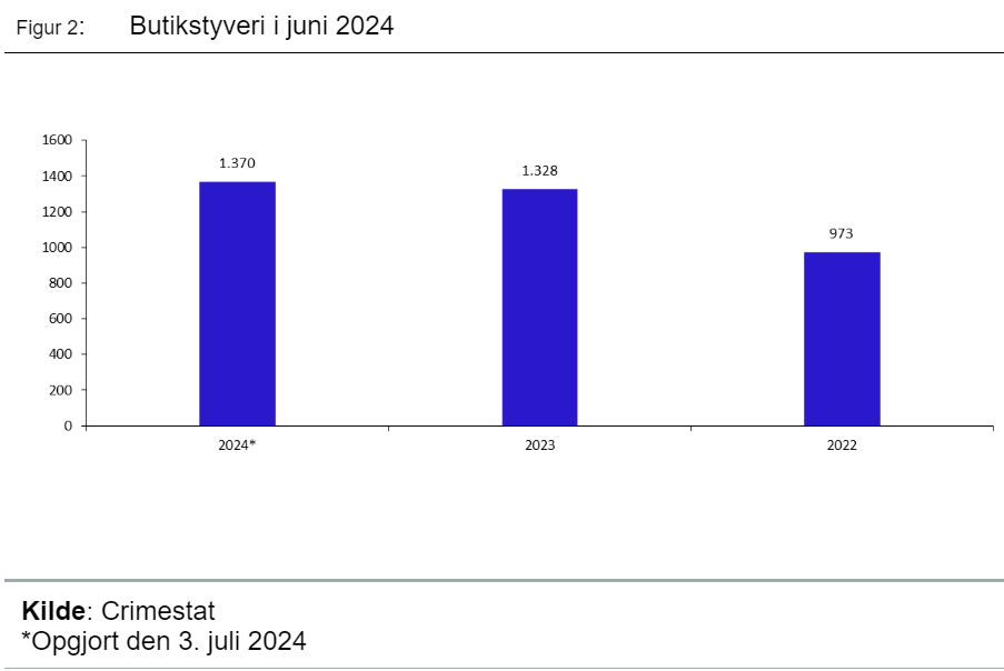 I juni 2024 blev der registreret 1.370 butikstyverier, svarende til en stigning på 3 pct. sammenholdt med juni 2023, og en stigning på 41 pct. fra 2022 til 2024.