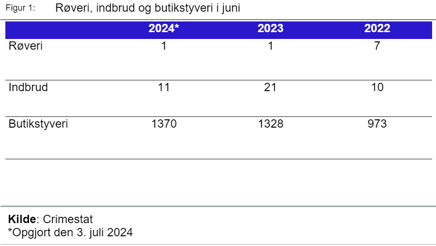 Crimestat kan nu præsentere data for butikstyverier, røverier og indbrud for juni 2024; sommermåneden afslører et beskedent fald.