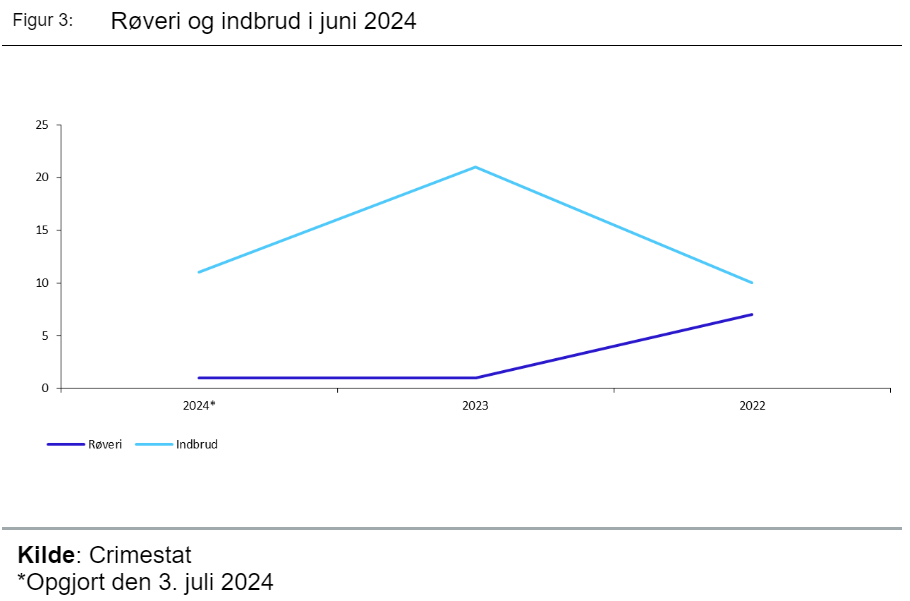 Overordnet set, ligger niveauet for røverier og indbrud på et forholdsvis lavt niveau. I juni 2024 blev der registreret et røveri, hvilket er det samme antal som i juni 2023. Dog er der sket et fald på fem registreringer fra 2022 til 2024.