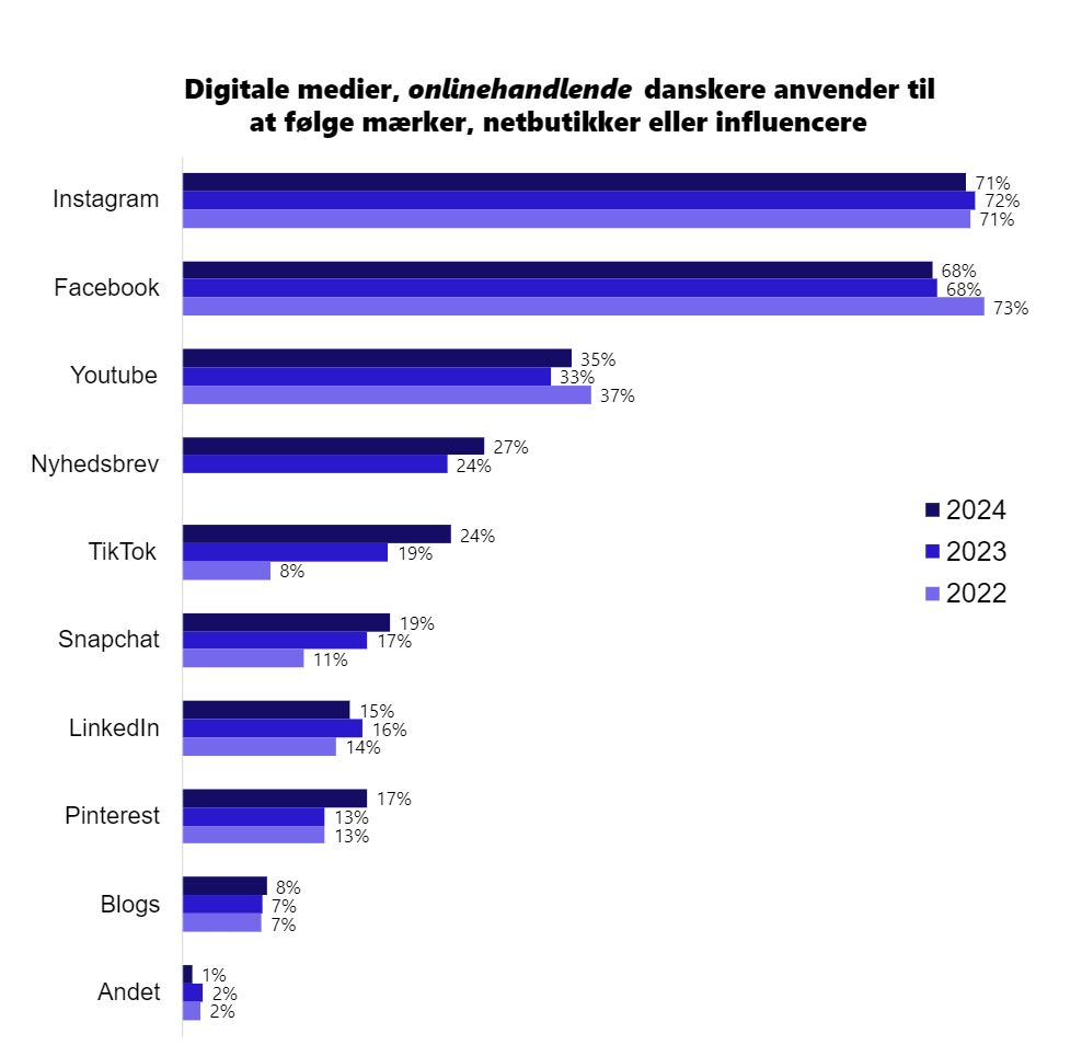 Analysen viser også, at der sker en interessant udvikling i forhold til, hvilke medier forbrugerne bruger til at følge influencers, brands og virksomheder.