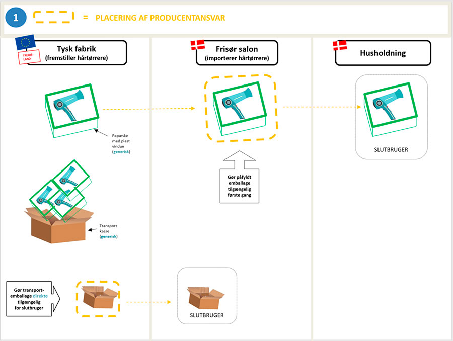 Et af eksemplerne fremgår af billedet herunder, hvor en dansk virksomhed importerer et produkt, i dette tilfælde en føntørrer, fra udlandet. Med den gule stiplet firkant angives, hvem der er producentansvarlig.