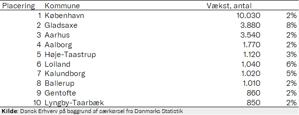 Særkørslen fra Danmarks Statistik, som Dansk Erhverv har fået udarbejdet, viser, at ti kommuner tilsammen drevet har 81 pct. af fremgangen i lønmodtagerbeskæftigelsen fra 4. kvartal 2022 til 4. kvartal 2023.