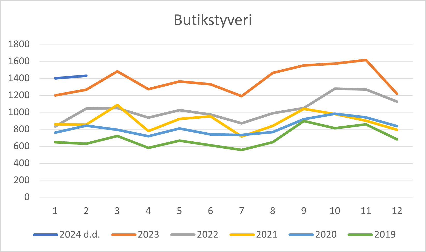 I 2023 blev der samlet registreret 16.505 butikstyverier i Crimestat, hvilket betyder, at der i gennemsnitt blev registreret 1.375 butikstyverier om måneden i 2023. Ud fra 2024 to første måneder er der allerede registreret flere butikstyverier pr. måned sammenholdt med gennemsnittet for 2023..