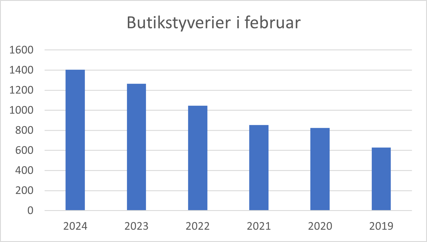 I anden måned af 2024 blev der registreret 1.429 butikstyverier, hvilket er 163 flere end i februar 2023, svarende til en stigning på knapt 13 procent Siden 2022 er stigningen på knapt 37 procent, tilsvarende til 384 flere butikstyverier. Der skal dertil bemærkes, at der i februar 2024 var en ekstra dag sammenholdt med 2023 og 2022. På den 29. februar 2024 blev der registreret 35 butikstyverier, hvilket således ikke i sig selv kan forklare stigningen fra de foregående år.