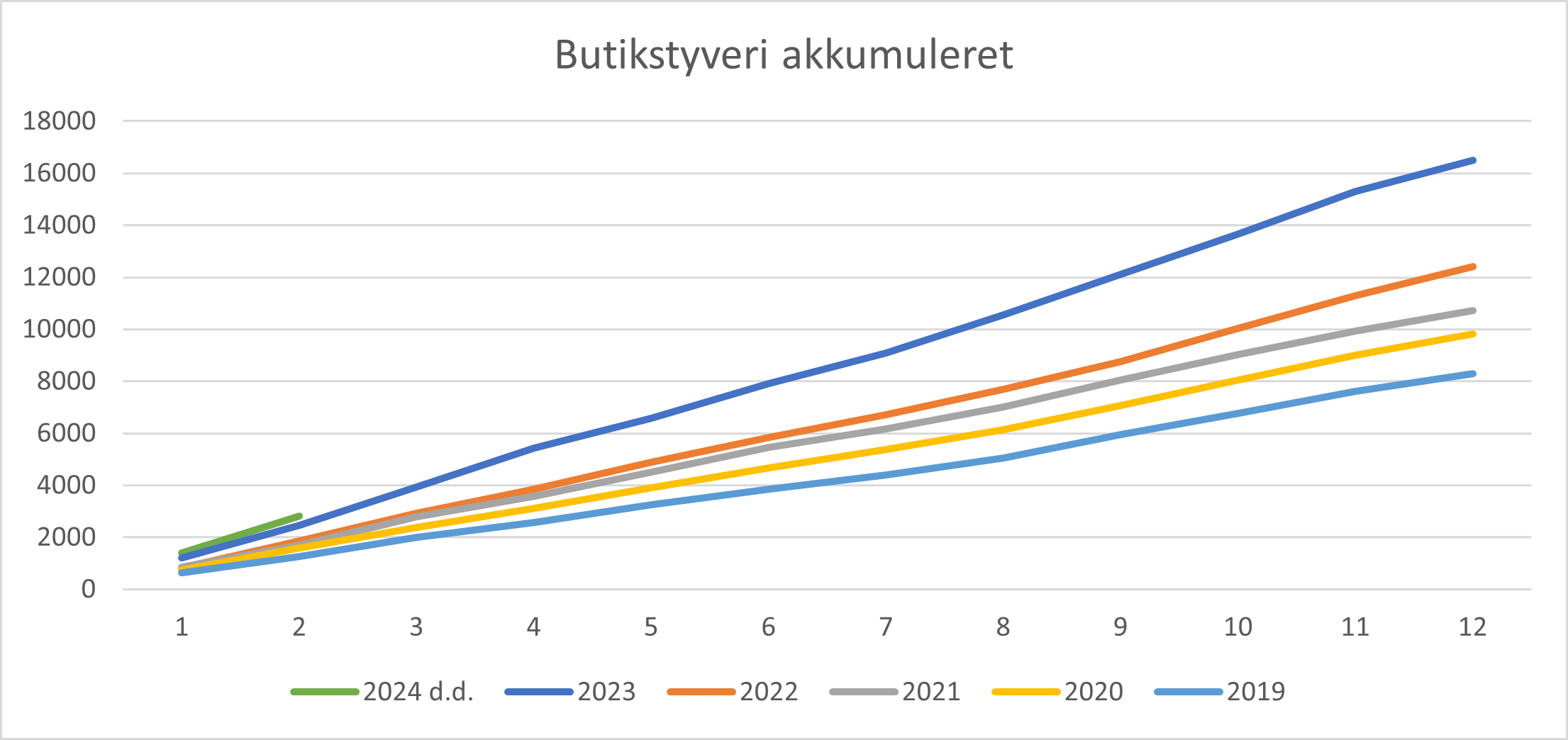 Antallet af butikstyverier ser ud til at stige også i 2024, hvor der i februar 2024 har blev registreret 30 flere tyverier end i januar – dette på trods af at februar havde to færre dage end januar 2024.