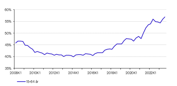 På bare 10 år er antallet steget med 53.9000 personer, hvilket svarer til en stigning på hele 105 pct. Til sammenligning er den samlede lønmodtagerbeskæftigelse steget med 17 pct. i samme periode. I 3. kvartal 2023 var 105.100 kvinder, der er indvandret fra ikke-vestlige lande, i et lønmodtagerjob.