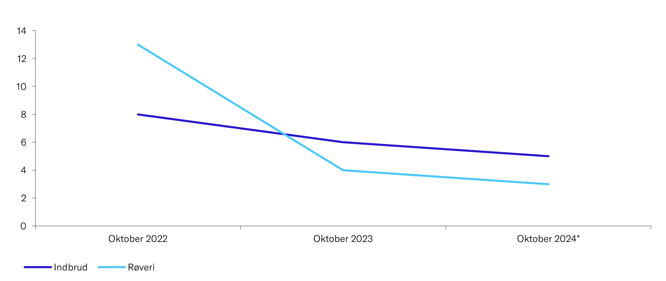 Men glædeligt er det, at både indbrud og røverier er faldet siden 2022. I oktober 2024 blev der registreret 5 indbrud og 3 røverier. Dermed er både røverier og indbrud faldet med én registrering hver sammenholdt med året før. På nuværende tidspunkt er der registreret 91 indbrud, hvorimod der ”kun” var registreret 89 indbrud på samme tidspunkt sidste år. Derudover er der på nuværende tidspunkt registreret 41 røverier, hvor der på samme tidspunkt sidste år var registreret 28 røverier.