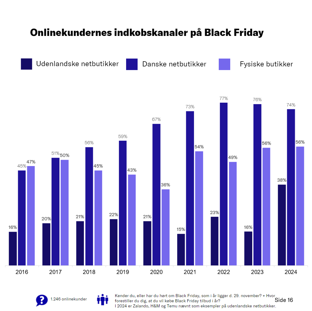 Godt 4 ud af 10 (44 procent) af forbrugerne, har i oktober 2024 udskudt et køb i forhåbning om, at de kan få det på tilbud til Black Friday. Siden 2016 har der været en generel stigning i andelen af forbrugere, som har udskudt et køb, i håb om at finde det billigere Black Friday.