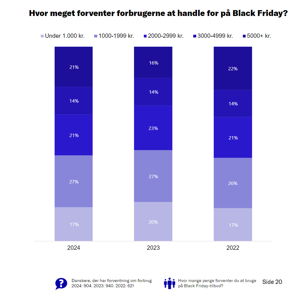 Godt halvdelen af onlinekunderne forventer at handle i forbindelse med Black Friday, og andelen af onlineforbrugere, der forventer at bruge 5.000 kr. eller mere, er steget markant. I 2023 var det 16 procent, der planlagde at bruge mere end 5.000 kr., mens hele 21 procent forventer at bruge dette beløb i 2024.