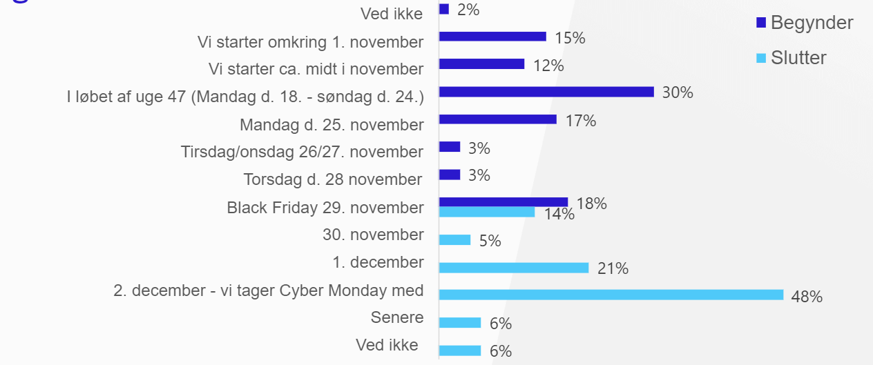 Ifølge Dansk Erhvervs undersøgelse der blot 14 procent af butikkerne, der kun kører med tilbud på selve fredagen. Knap hver tredje begynder i uge 47 – altså to uger før.
