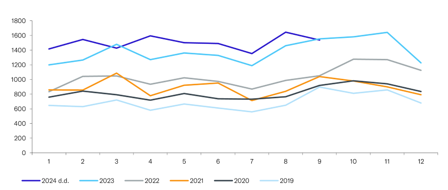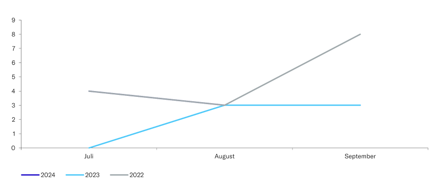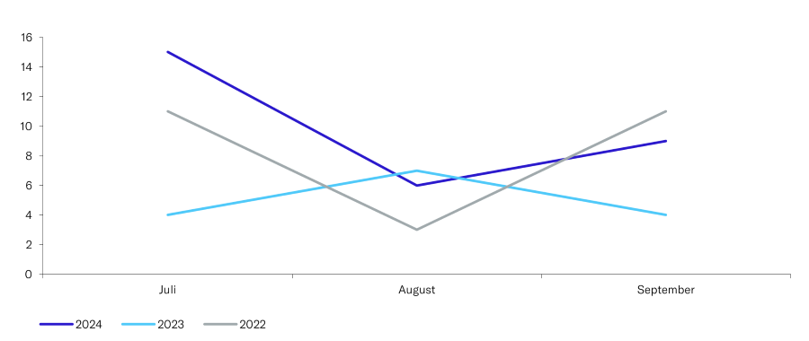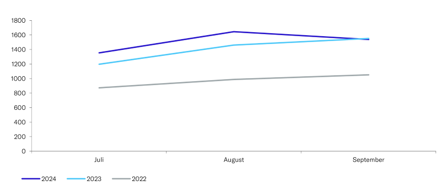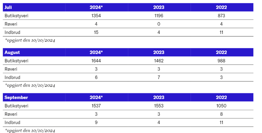 I juli 2024 blev der registreret 1.354 butikstyverier. Dermed var det et stort spring, da tallene fra august måned trillede ind. August toppede ranglisterne med 1.644 registrerede butikstyverier svarende til en stigning på 21 pct. fra juli til august måned. September bød på et lille fald sammenholdt med august.