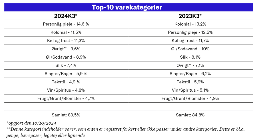 I tredje kvartal af 2024 var det varekategorien personlig pleje der oftest blev stjålet. Dette var ikke samme tendens i tredje kvartal af 2023, hvorimod det var kolonial der var den oftest stjålne varekategori. I tredje kvartal af 2024 er personlig pleje steget med 1,4 procentpoint sammenholdt med 2023, og overhaler dermed kolonial. I tredje kvartal af 2023 lå personlig pleje på en anden plads, hvorimod kolonial ligger på en anden plads i tredje kvartal af 2024. For begge perioder er det gældende at køl og frost ligger på en tredjeplads.