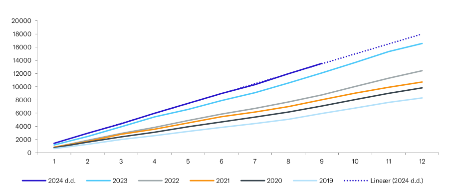 I 2023 blev der registreret 16.556 butikstyverier i Crimestat. Fra den 1. januar 2024 til slutningen af september 2024 er der registreret 13.507 butikstyverier. Dette svarer til, at der i gennemsnit er registreret ca. 1.500 butikstyverier om måneden og viser tydeligt den generelle stigning i butikstyverier. Dansk Erhverv vurderer dermed, at der i slutningen af året vil være registreret omkring 18.000 butikstyverier, svarende til en stigning på ca. 9 pct. sammenholdt med 2023.