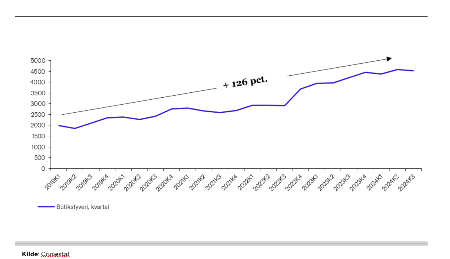 I 2023 blev der registreret 4.211 butikstyverier i tredje kvartal, svarende til at der er sket en stigning på 7,5 procent sammenholdt med tredje kvartal af 2024. Hvis der tværtimod ses to år tilbage til tredje kvartal i 2022, så er det sket en voldsom stigning på 55 procent. Stigningen har været længe undervejs, og selvom 2023 allerede var et rekordår for butikstyverier, ser det ud til, at 2024 desværre bliver endnu værre. Siden første kvartal i 2019 og frem til tredje kvartal af 2024, er der sket en stigning i antal registrerede butikstyverier på 126 procent.