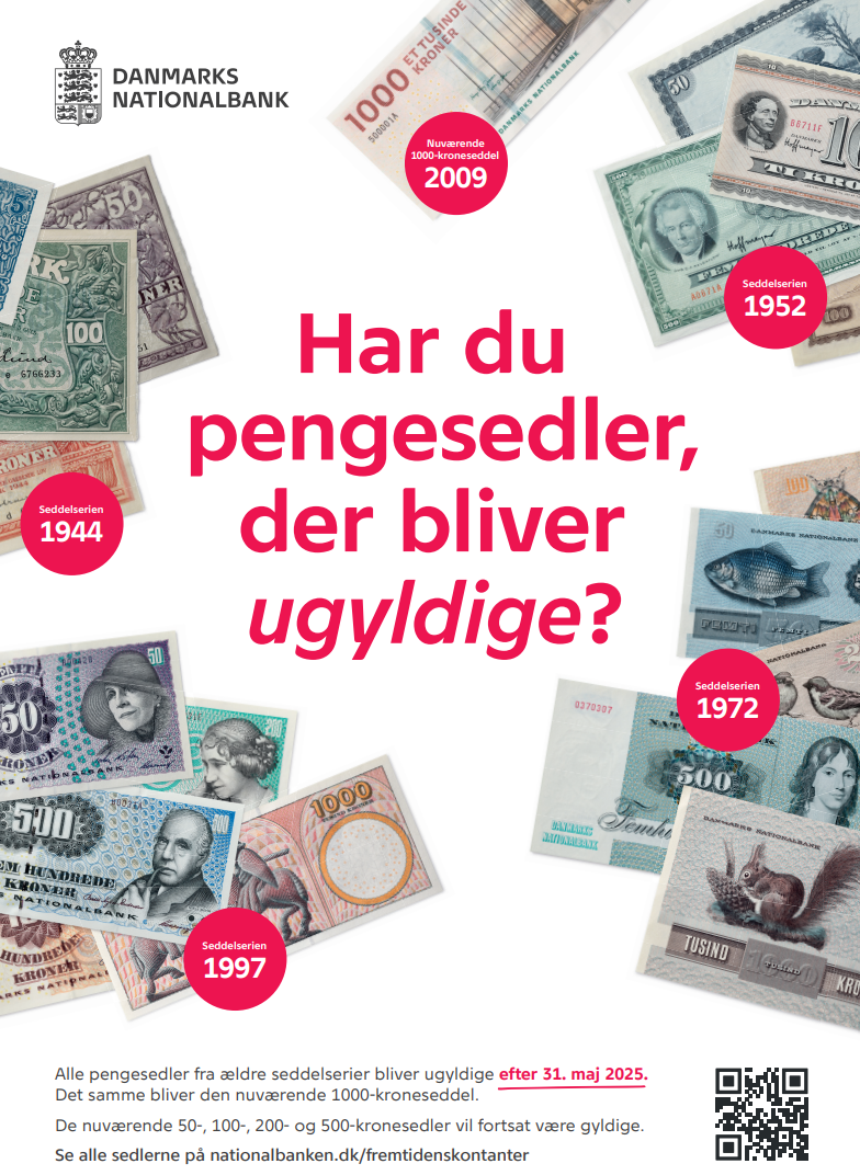 I hele september sætter Nationalbanken et ekstra stort fokus på, at alle pengesedler fra ældre seddelserier, samt den nuværende 1.000-kroneseddel, vil blive ugyldige efter den 31. maj 2025.