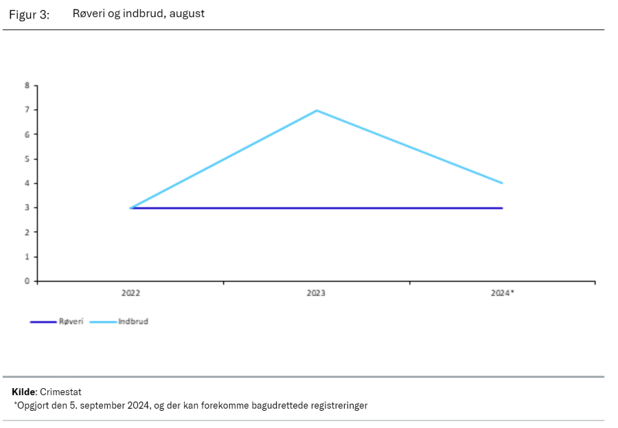 I august 2024 blev der registreret tre røverier, hvilket er samme niveau både i august 2023 og 2022. Hvis der kigges tilbage til august 2019 og frem til august 2024, så er der sket et fald fra ni til tre registreringer, svarende til et fald på ca. 66 pct. Dog er niveauet for røverier overordnet på et forholdsvis lavt niveau.
