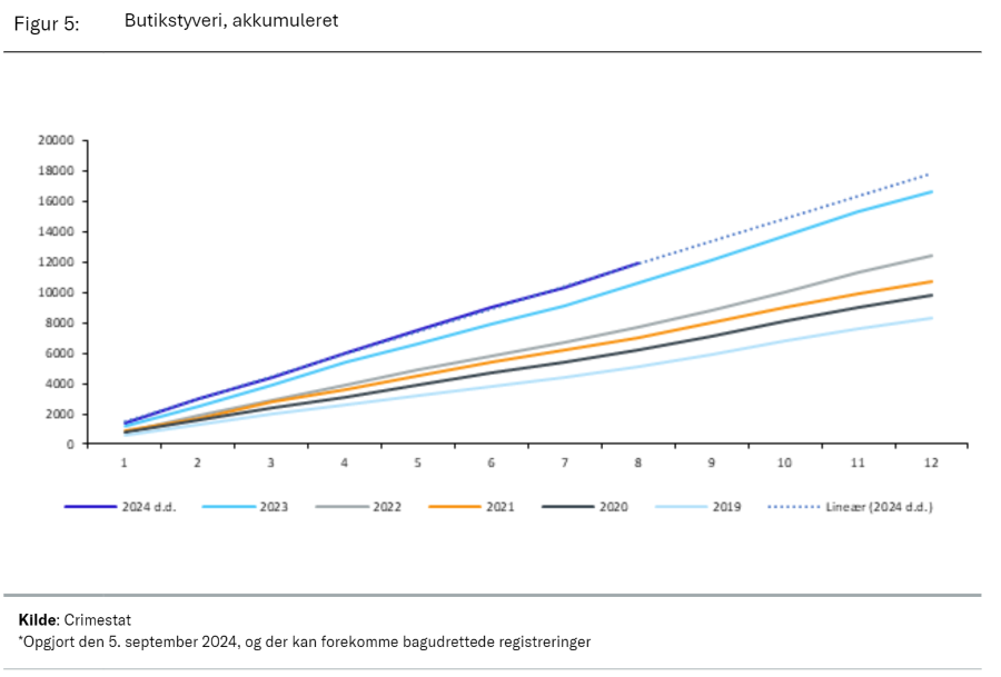 Hvis vi ser længere tilbage i tiden, hvor tidsperioden januar til slut august er udgangspunktet, er der sket en stigning på cirka 134 pct. fra 2019 til 2024. Dette svarer til, at der i gennemsnit per måned er registreret ca. 850 flere butikstyverier om måneden i 2024 end i 2019.