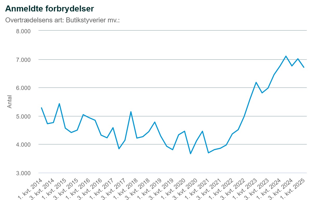 Ser man længere tilbage, er stigningen tydelig: I første kvartal af 2023 blev der anmeldt 6.179 butikstyverier, hvilket altså svarer til en stigning på 532 anmeldelser holdt op imod første kvartal af 2025.