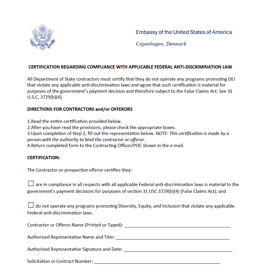 I brevet står der, at virksomhederne skal skrive under på, at de overholder amerikansk føderal anti-diskriminationslovgivning i relation til DEI. DEI er en forkortelse for Diversity, Equity & Inclusion.