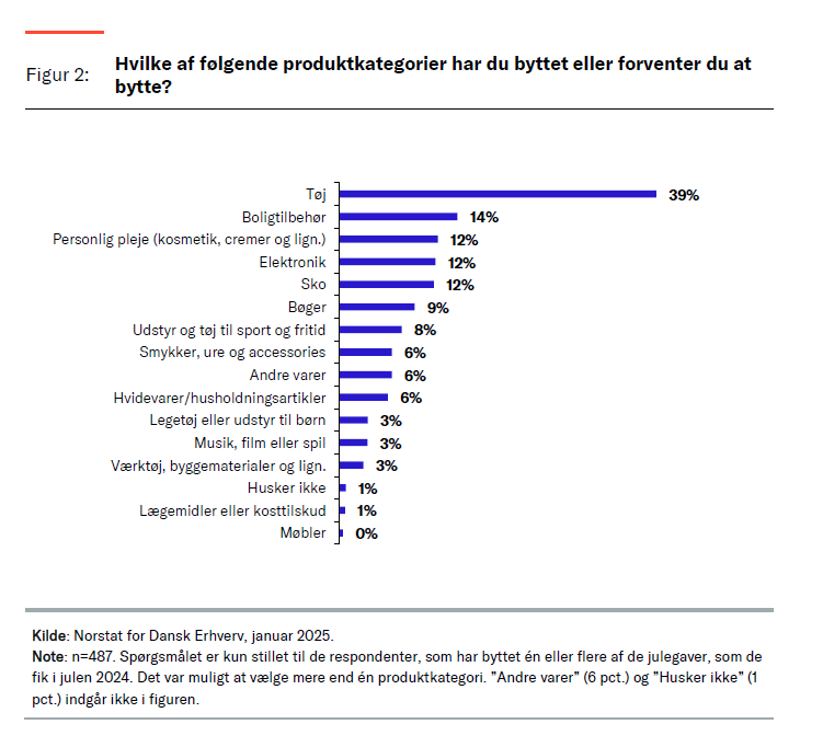 ”Som de tidligere år, er det tøj, hvor det er sværest at ramme plet. Efter julen 2024, svarede 39 procent af dem, der skulle bytte julegaver, at de skulle bytte tøj”, oplyser Bo Dalsgaard.