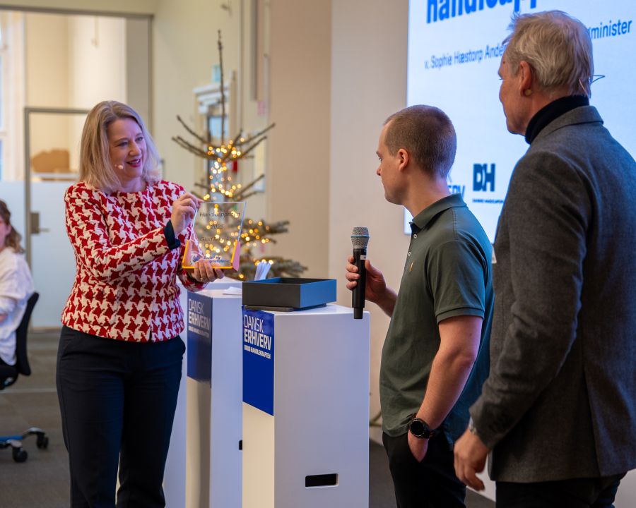Social- og boligminister Sophie Hæstorp Andersen uddelte Socialministerens Handicappris 2025 til dette års vinder, Glad Teknik, og fremhævede virksomheden for at vise, hvordan målrettet inklusionsarbejde skaber resultater og inspiration for andre, og hvordan forskellighed bliver en styrke.