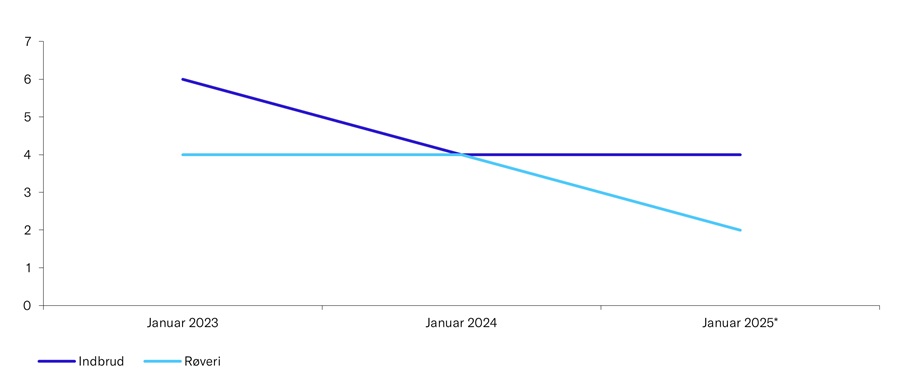 Mere glædeligt er det, at både indbrud og røverier er faldet siden 2022. I januar 2025 blev der registreret 4 indbrud og 2 røverier. Dermed er indbrud på samme niveau som sidste år, hvorimod røverier er faldet med to registreringer sammenholdt med året før. I 2024 blev der registreret 4 røverier og 4 indbrud, og der forventes et fortsat lavt niveau i 2025.