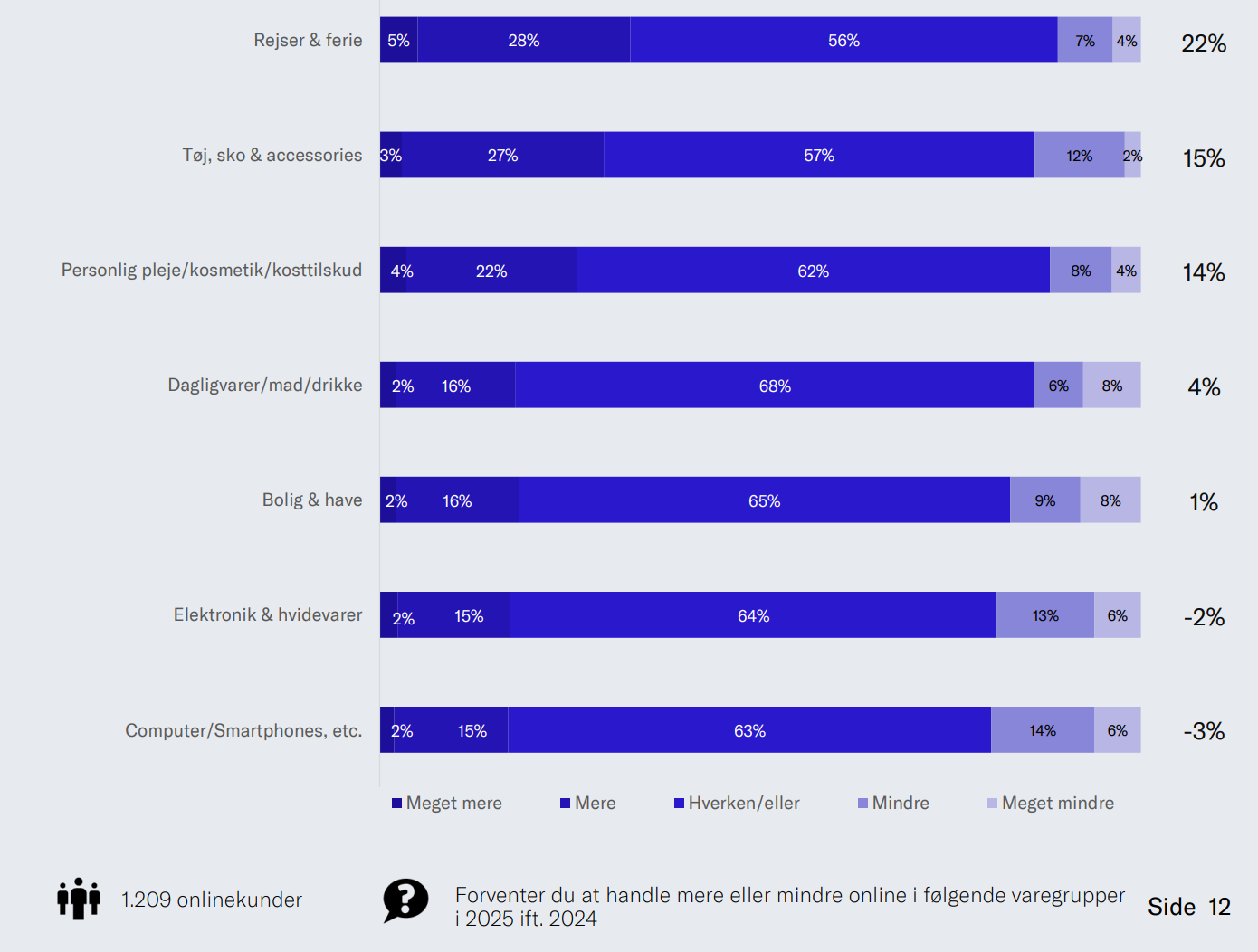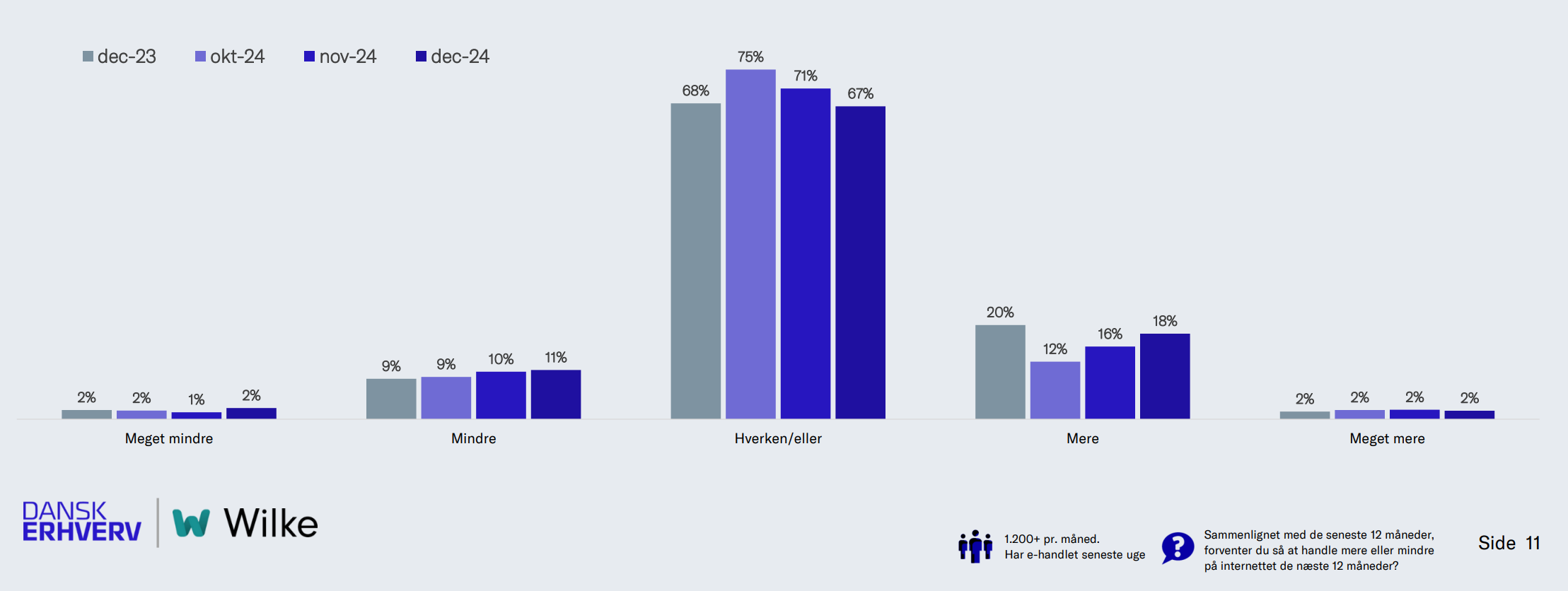 I analysen, der blev lavet i december 2024, forventer netto 7,2 procent af onlinekunderne at øge forbruget de kommende 12 måneder i forhold til det foregående år. Gennemsnittet har de seneste 12 måneder været 3 procent, så forventningerne ligger i december pænt over gennemsnittet.
