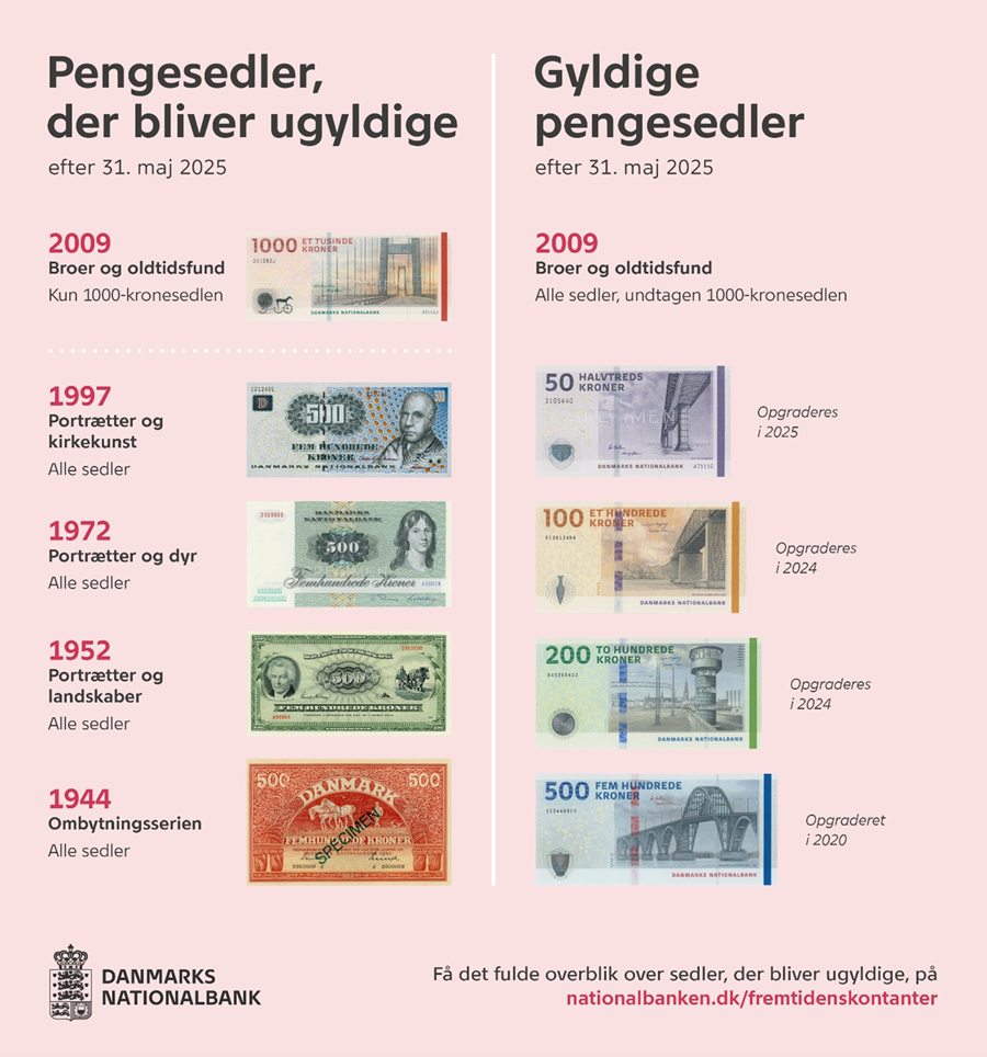 I Grønland og på Færøerne vil der også blive mulighed for at indløse sedler i perioden fra 1. juni 2025 til 31. maj 2026.