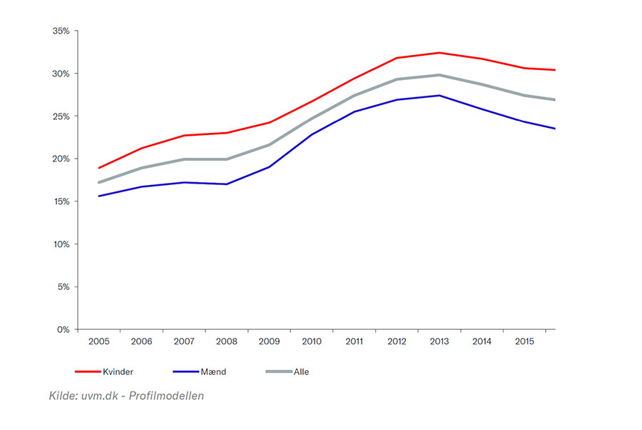 I 2013 var det næsten 30 pct. af de unge, der stod til at få en universitetsuddannelse. I år er dette tal faldet til knap 24 pct. Faldet er dog meget ulige fordelt på mænd og kvinder. Mens kvinderne var helt oppe på, at 32 pct. ville få en universitetsuddannelse i 2013, så er forventningen i dag et fald på et fald på 4 procentpoint til 28 pct.