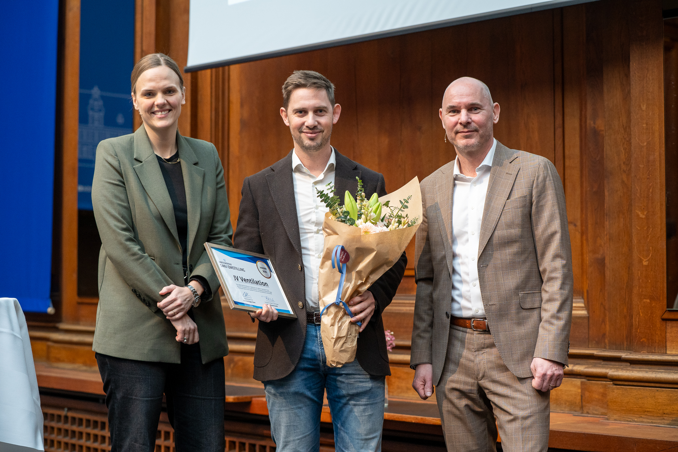 Efter en indsigtsfuld velkomst inviterede dagens moderator, Marie Høst, Digitaliseringsminister Caroline Stage på scenen for at uddele prisen for Årets Digitale SMV:Omstilling – en anerkendelse af SMV’er, der gennem digitalisering løfter deres forretning. Sammen med formanden for Rådet for SMV:Digital, Peter Rosenkrands, overrakte hun prisen til årets vinder, JV Ventilation, der har styrket deres virksomhed ved at integrere AI og Augmented Reality i deres daglige arbejde.