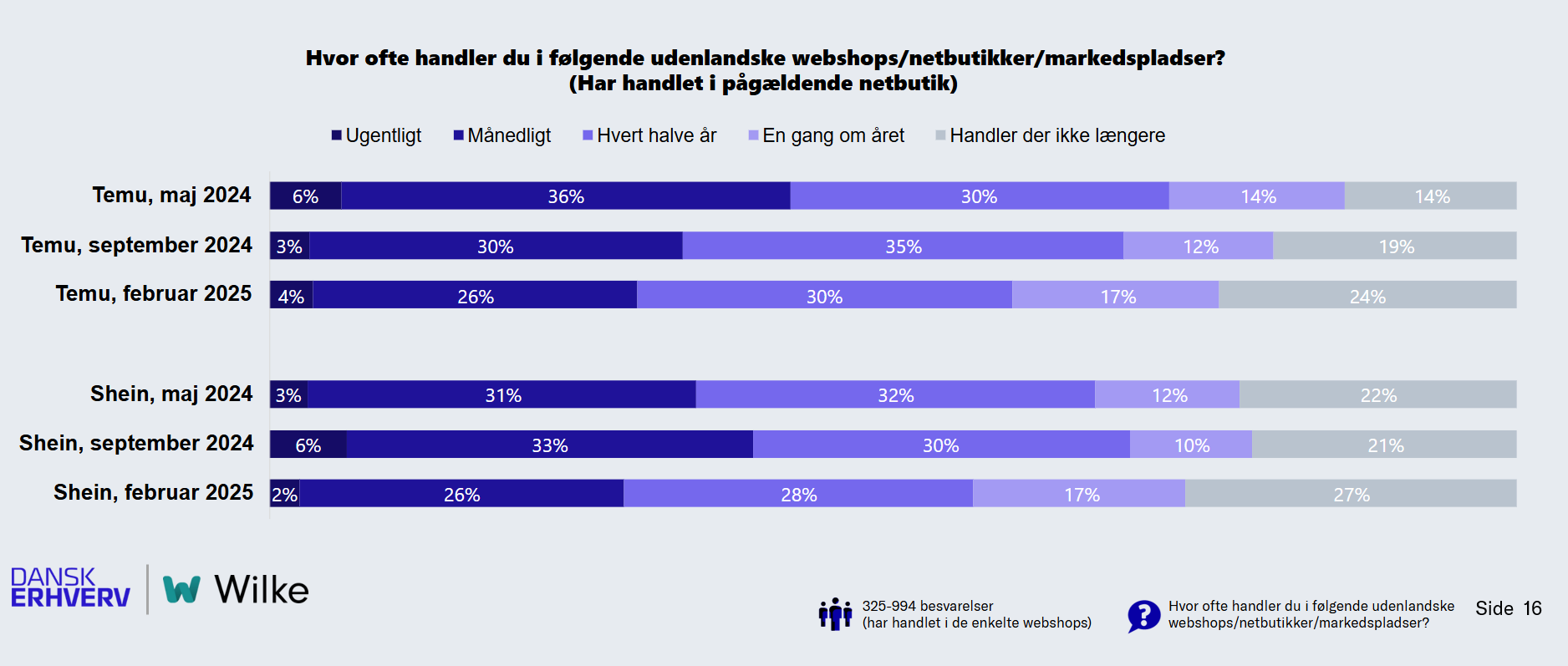 Dansk Erhvervs nye analyse af forbrugernes brug af kinesiske platforme viser, at andelen af danskere, der ikke længere handler hos Temu er steget fra 14 procent i maj 2024 til 24 procent i februar 2025. Andelen, der handler månedligt på Temu, er i samme periode faldet fra 42 procent til 30 procent.
