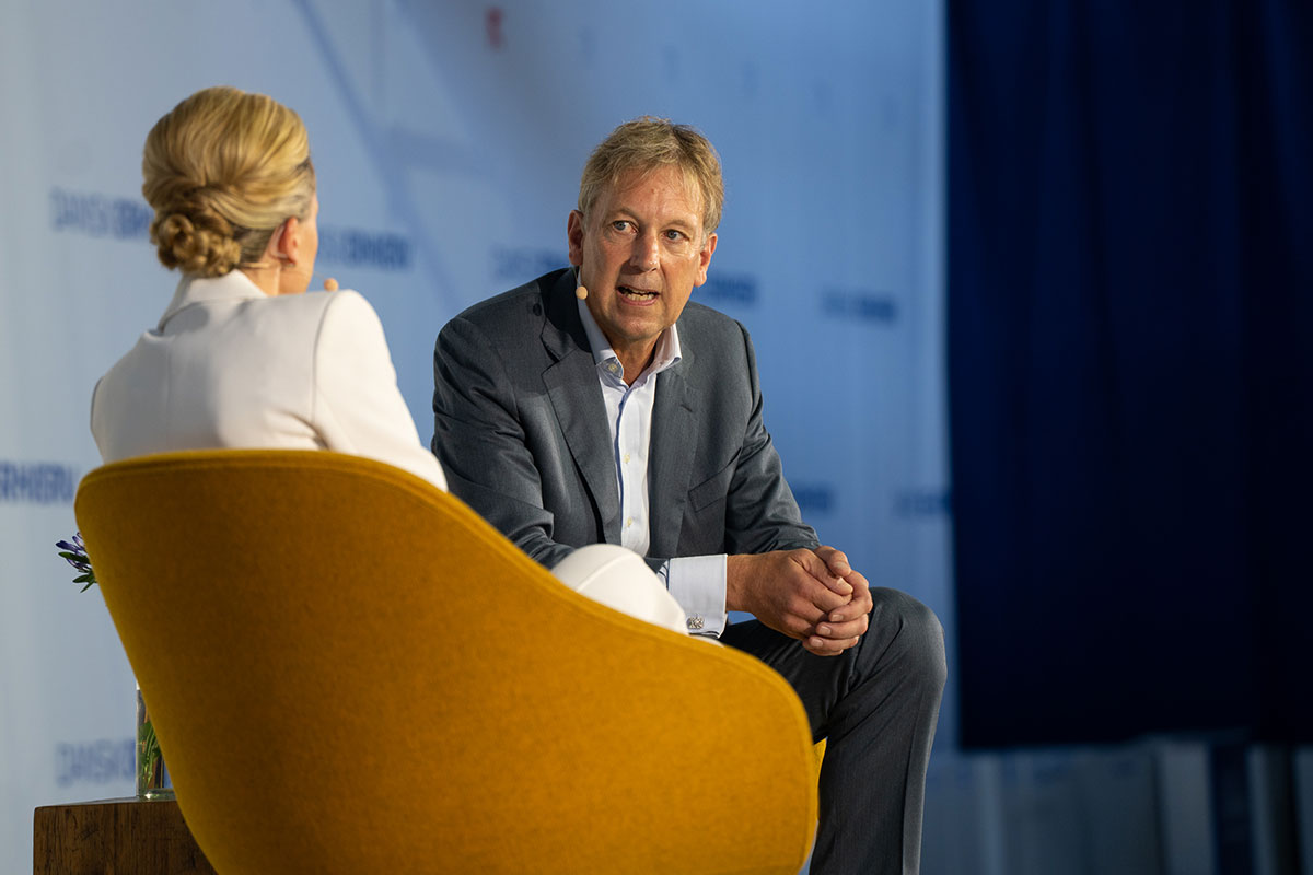 Morten Langager, direktør i Dansk Erhverv, byder velkommen til Jens Lund, adm. direktør i DSV – eller Miraklet fra Hedehusene, som virksomheden blev kaldt, da Jens Lund senere blev interviewet af Charlotte Beder på scenen.
