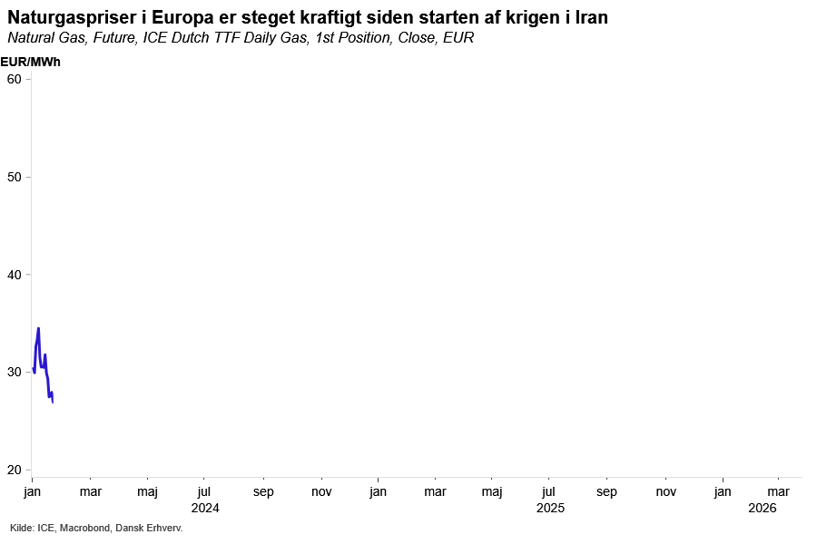 Globalt og i Europa er gaspriserne samtidig steget kraftigt. Det skal ses i lyset af den øgede risiko samt den manglede transport igennem Hormuzstrædet. Derudover har det statsejede energiselskab, QatarEnergy, rapporteret, at deres produktion af LNG har været udfordret ovenpå angreb på produktionsfaciliteter.