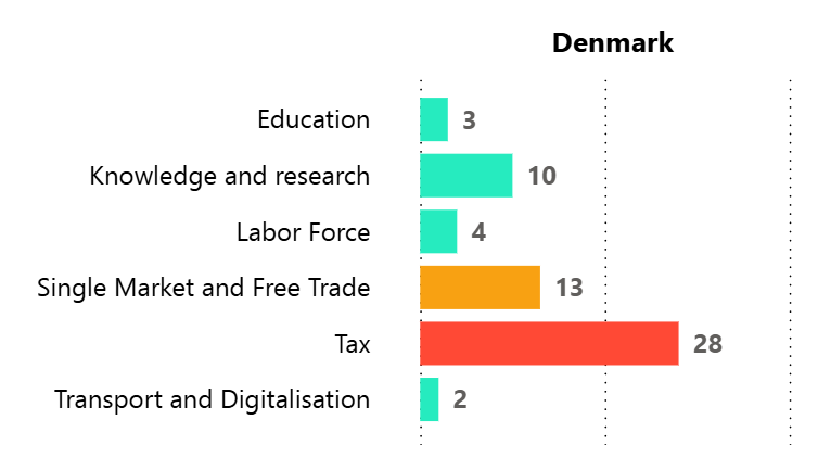 The bars indicate Denmark’s ranking among 35 OECD countries. Green represents a position in the top third, yellow the middle third, and red the bottom third compared to other countries for each indicator. Explore the data at the top of the page.